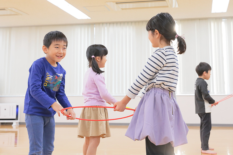 リトミックでは、社会性、協調性を育むとともに、集団のなかでの自己表現、子どもたち同士の触発など、グループレッスンの方がメリットが大きいのです。教室では、グループレッスンと個人レッスン、それぞれの長所を生かして、小グループ制をとっています。